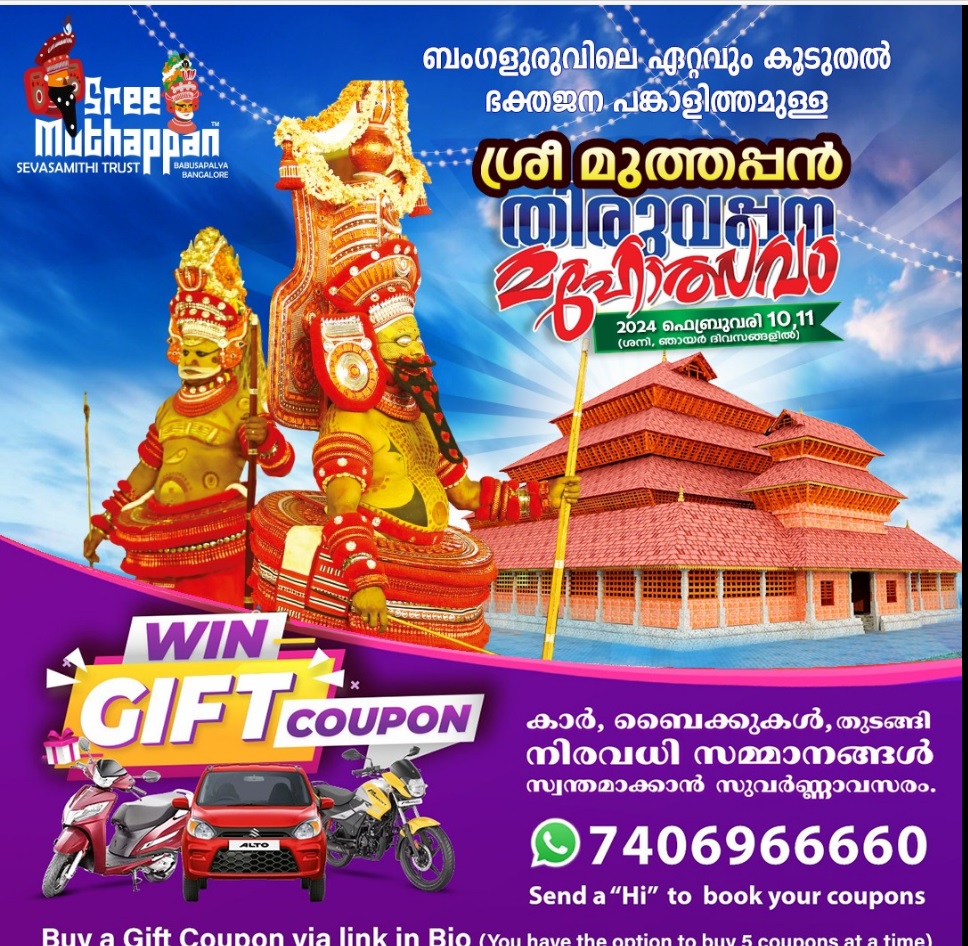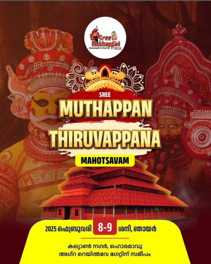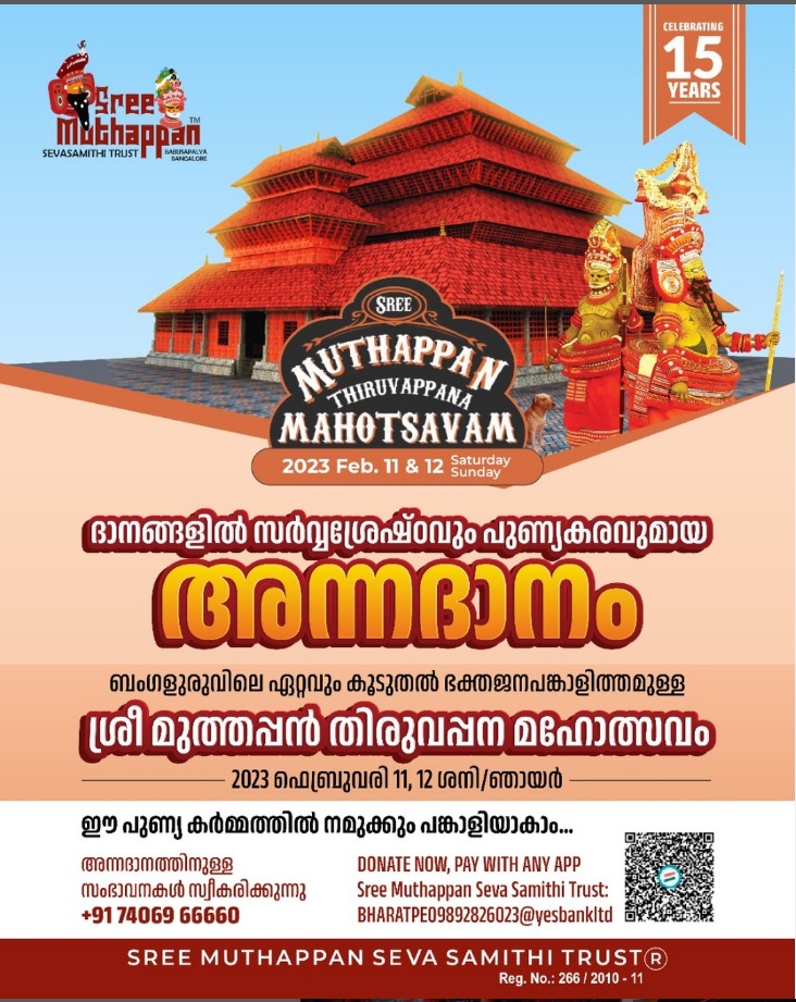 ശ്രീ മുത്തപ്പൻ സേവാ സമിതി ട്രസ്റ്റ് 2023 ഫെബ്രുവരി 11, 12 തീയതികളിൽ ആഗ്ര റെയിൽവേ ഗേറ്റിന് സമീപം (ന്യൂ മില്ലേനിയം സ്കൂളിന് സമീപം) ബംഗളൂരുവിലെ ഏറ്റവും കൂടുതൽ ഭക്തജന പങ്കാളിത്തമുള്ള ശ്രീ മുത്തപ്പൻ തിരുവപ്പന മഹോത്സവം സംഘടിപ്പിക്കുന്നു. ഈ അവസരത്തിൽ, ഏകദേശം 10,000 ഭക്തർക്ക് ഞങ്ങൾ അന്നദാനം (വിശുദ്ധ ഭക്ഷണ വഴിപാട്) നൽകുന്നു.