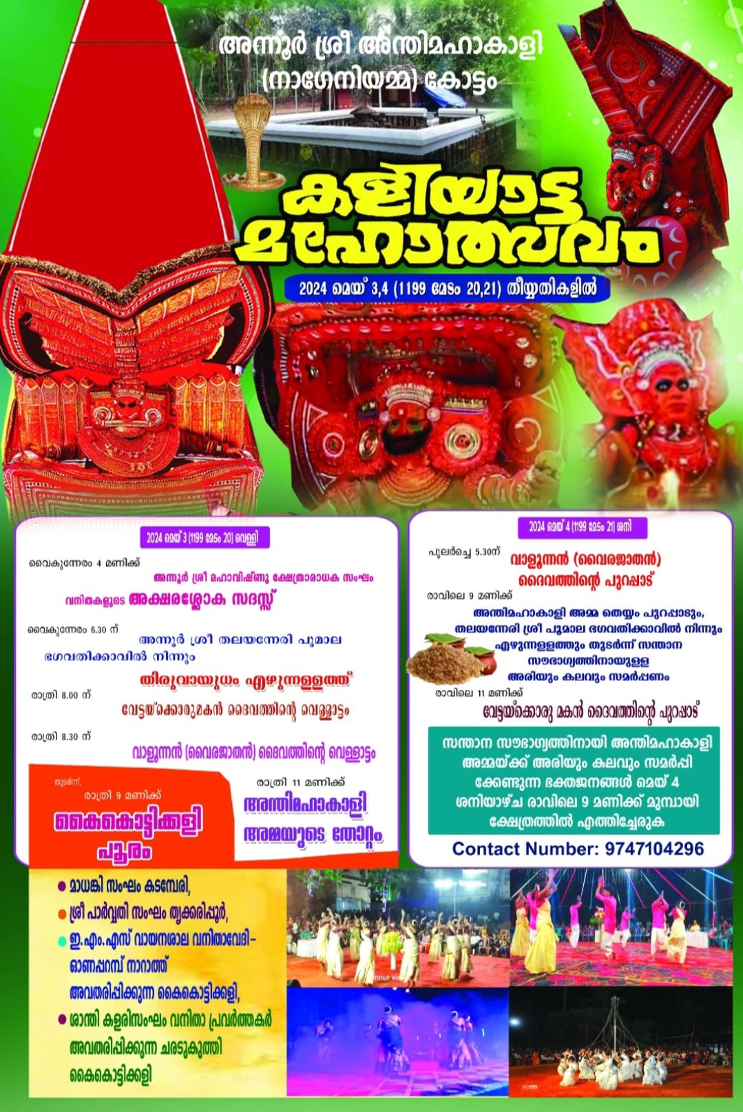 Anthimahakali theyyam is annually performed at Annur Sree Anthimahakali Nageniyamma Kottam Temple from May 3 to May 4.
