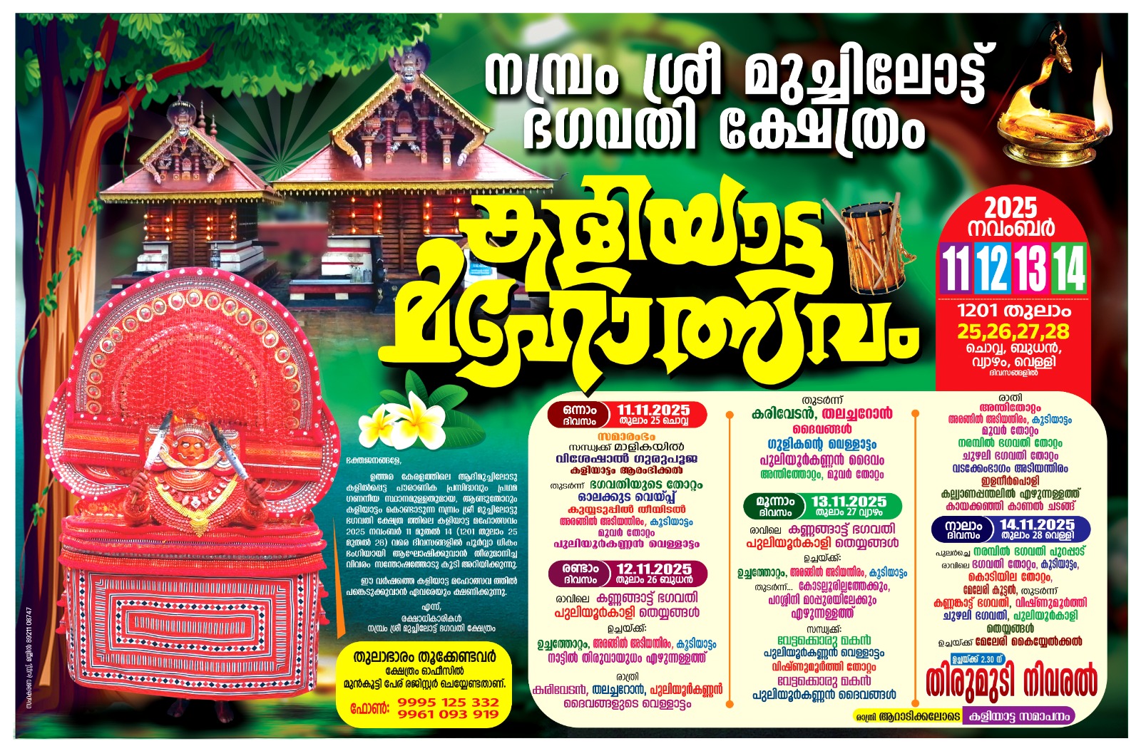 മുച്ചിലോട്ട് ഭഗവതിയും കൂടെയുള്ളോരും കോടല്ലൂര് തന്ത്രിയെയും മുത്തപ്പനുമായി കൂടികാണുന്ന ചടങ്ങ് ഇവിടെ പ്രധാനപ്പെട്ടതാണ്. മൂന്നാം ദിവസവും കാവില് നിന്നും പറശ്ശിനി മടപ്പുരയിലേക്ക് എഴുന്നുള്ളിപ്പ് ഉണ്ടാകും. മുച്ചിലോട്ട് ഭഗവതിയെ കൂടാതെ കണ്ണങ്ങാട്ട് ഭഗവതി, പുലിയൂര് കാളി, ചുഴലി ഭഗവതി,പുലിയൂര് കണ്ണന്, ചുഴലി ഭഗവതി, ചാമുണ്ഡി, വിഷ്ണുമൂര്ത്തി, നരമ്പില് ഭഗവതി, ഗുളികന് എന്നീ തെയ്യക്കോലങ്ങളും ഇവിടെ കെട്ടിയാടും.