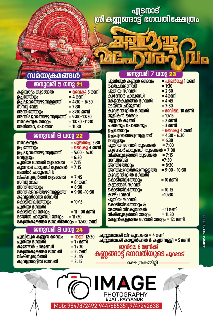 ജനുവരി 7 ന് പുലർച്ചെ മുതൽ പുലിയൂർകണ്ണൻ, രക്തചാമുണ്ഡി, പുതിയ ഭഗവതി, കേളൻ കുളങ്ങര ഭഗവതി ,കുണ്ടോർ ചാമുണ്ഡി, മടയിൽ ചാമുണ്ഡി, കൂവളന്താറ്റിൽ ഭഗവതി, ഗുളികൻ എന്നീ തെയ്യക്കോലങ്ങൾ അരങ്ങിലെത്തും.