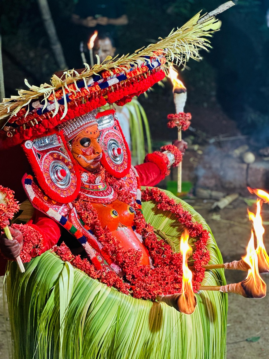 Potan Theiyam and Bhairavan Thira are the other Theiyams performed here along with this. Chutala is the place where Mahadeva ordered Bhadrakali, born from Shiva’s third eye, to stay after Darika’s death. The wick to Bhadrakali’s lamp is lit from the burning pyre.